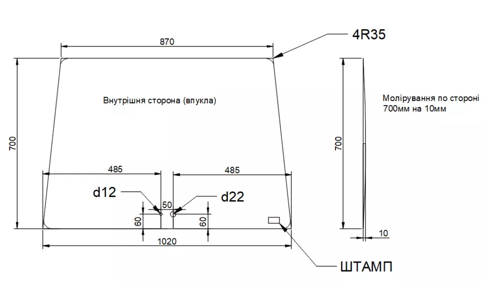 лобове скло гнуте 1020 х 870 х 700 з отворами